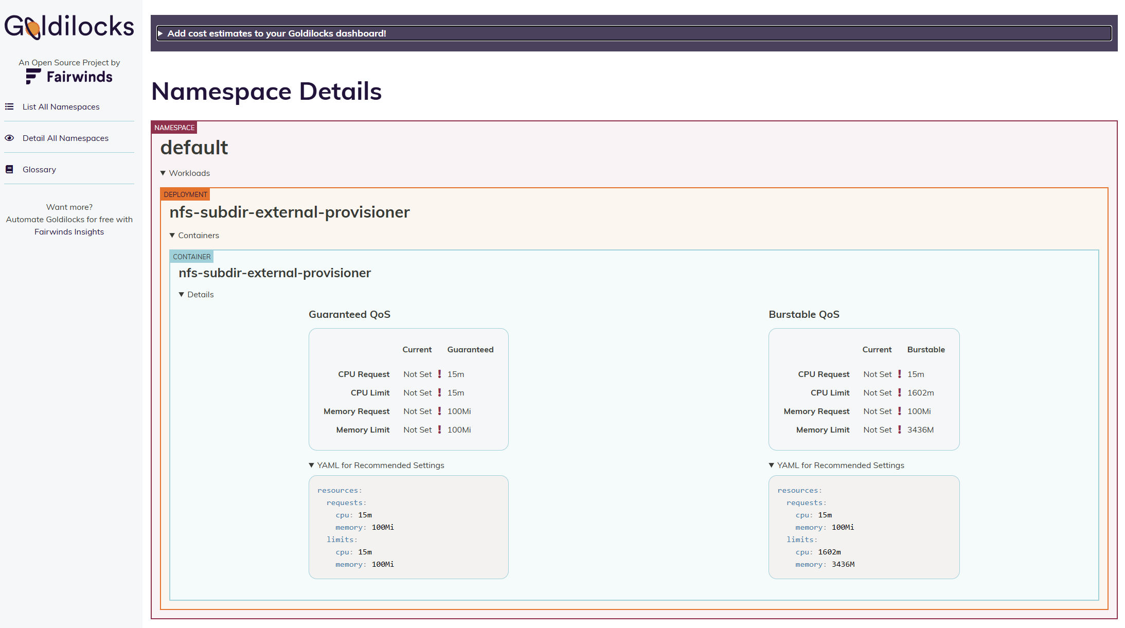 kubectl -n goldilocks port-forward svc/goldilocks-dashboard 8080:80