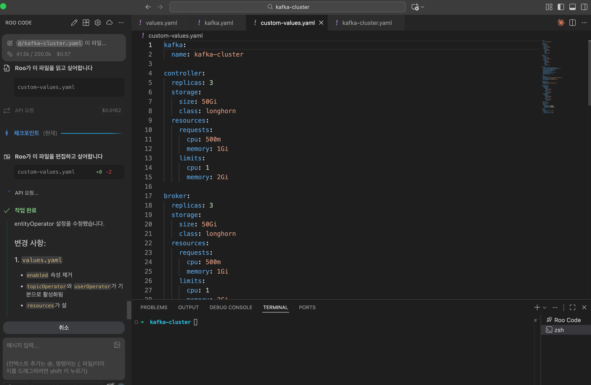 Roo Code 바이브 코딩 실전 - Kafka Cluster Helm template 만들기