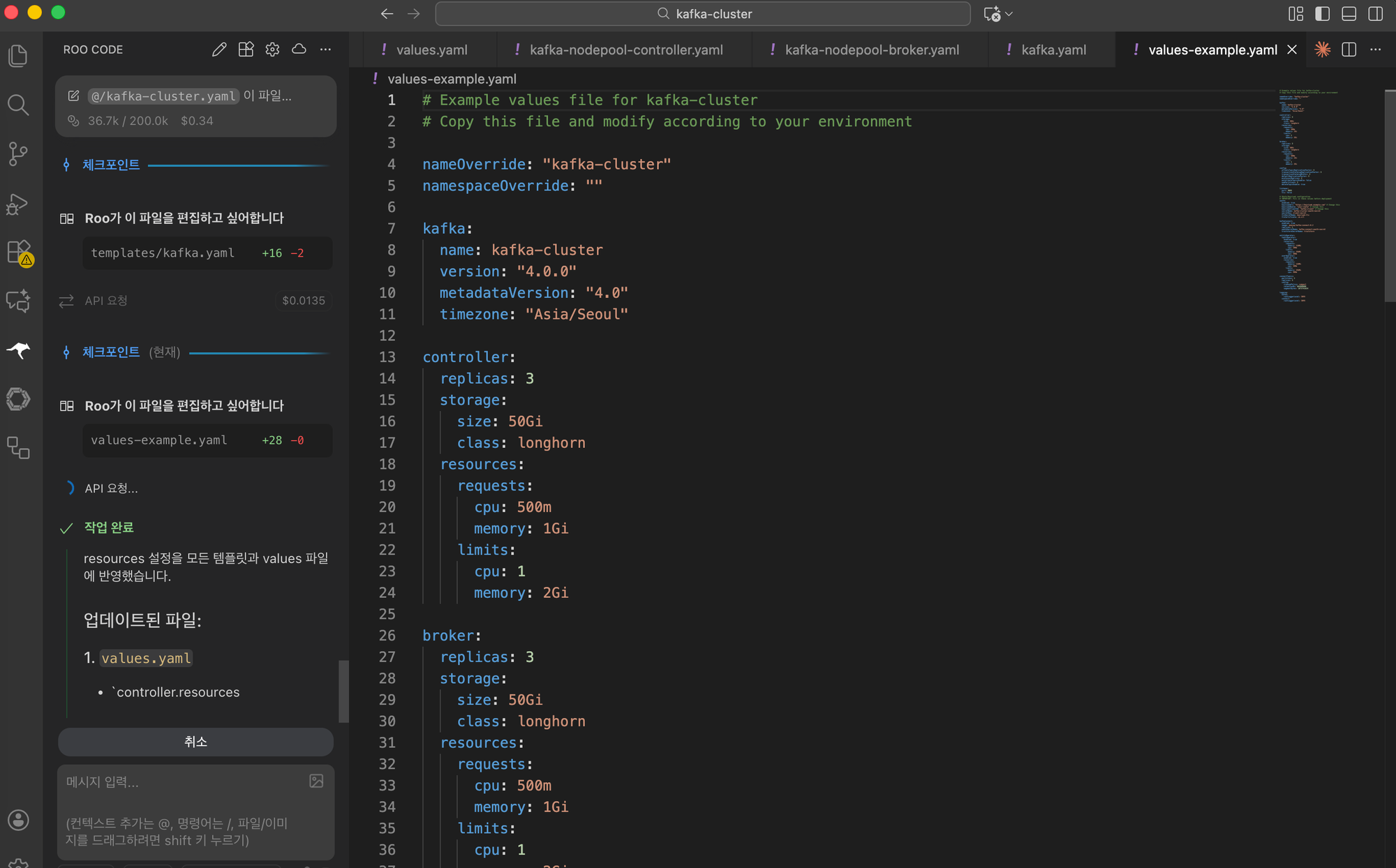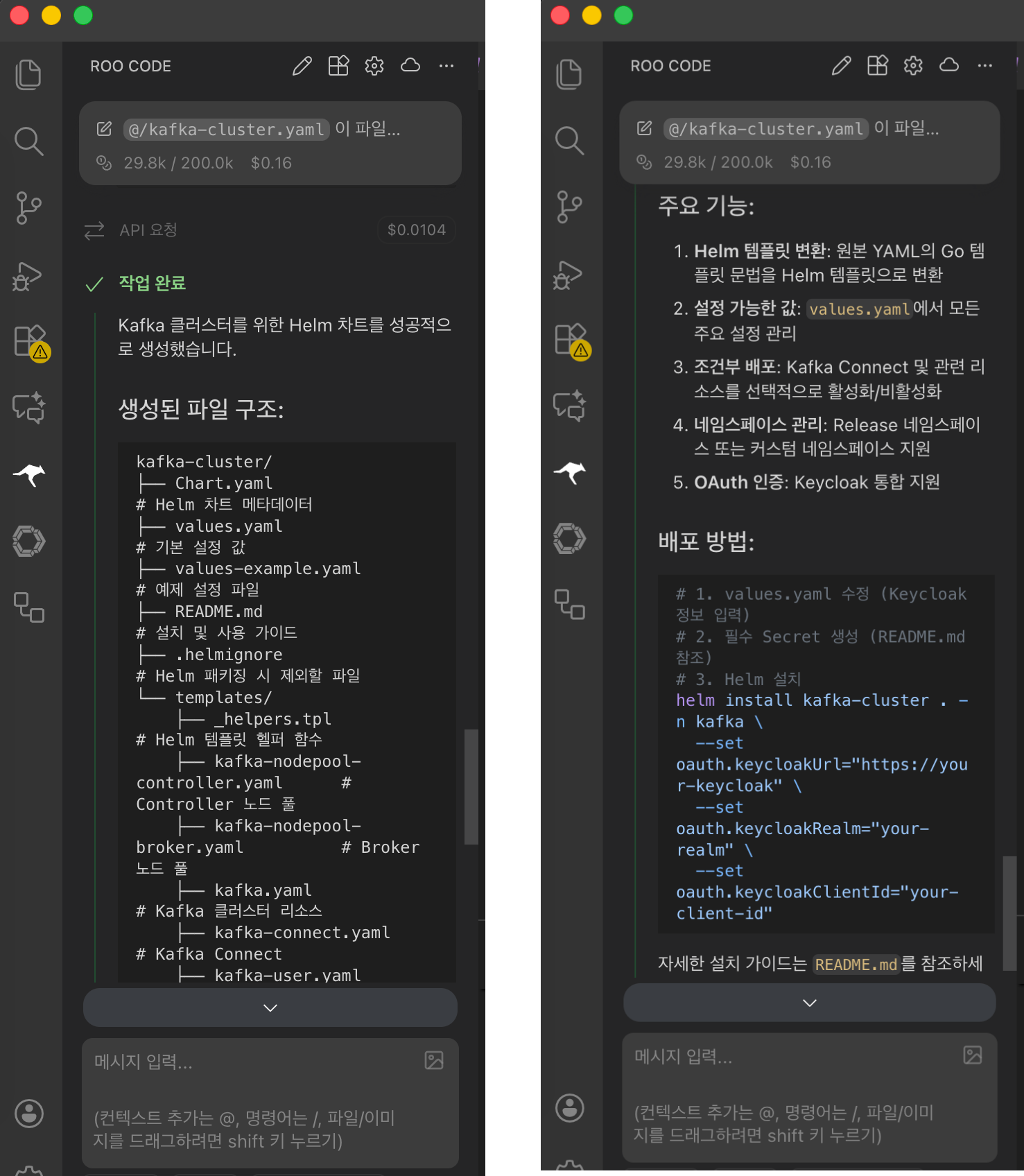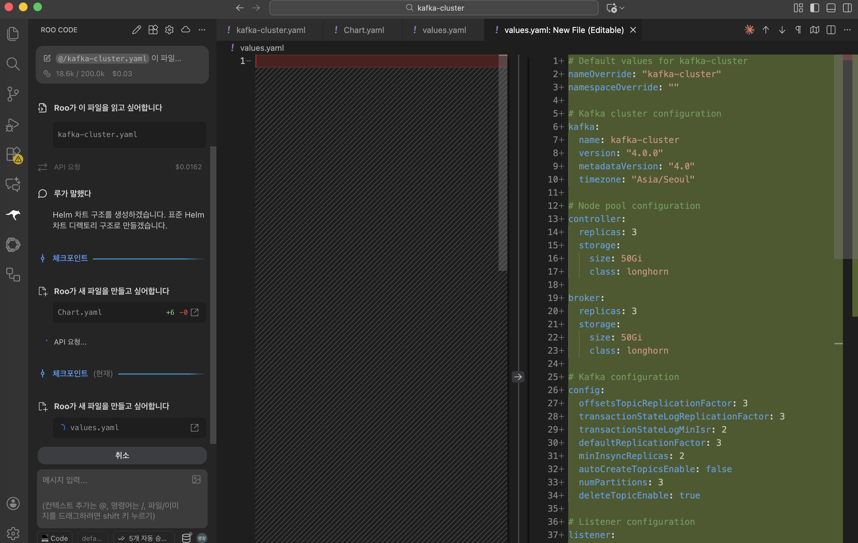 kafka-cluster 배포용 yaml 을 Helm template 형식으로 변환하는 예제를 Roo Code 를 이용하여 바이브 코딩으로 제작하는 과정을 설명합니다.
