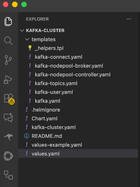 kafka cluster를 한꺼번에 배포하기 위해 controller, broker, kafak, kafka-connect, kafka-user, kafka-topic 을 multi 로 배포할 수 있는 yaml 을 만들어 관리하고 있으나, resource 와 volume 정보만 update 를 편리하게 하기 위해 helm template 으로 전환하고자 한다.