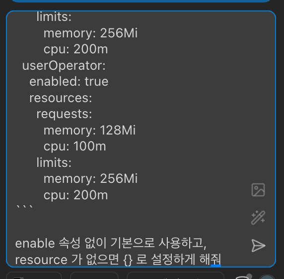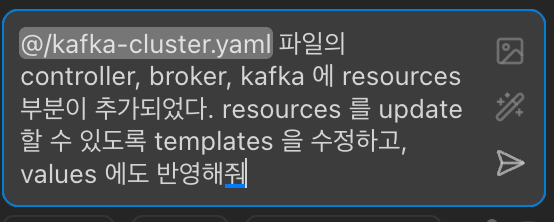 6) resources 들을 update 하는 것이 목적이었는데, 관련 설정들이 values.yaml 에 빠져있는 것을 확인했다. 참고가 되는 kafka-cluster.yaml 의 controller, broker, kafka 에 Resources 관련 내용을 추가하고, 다시 Roo 한테 작업을 지시한다.