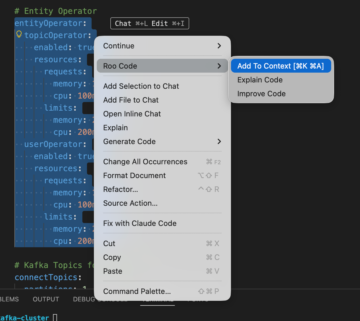 7) values.yaml 을 체크해 보니, entityOperator 부분에 있는 enable: true 부분이 필요없을 것 같아 다시 요청해 본다. 수정할 부분을 마우스로 드래그 한 후 Roo Code 창에서 Add To Context 부분을 클릭하면 Roo Chat 창으로 드래그 한 영역이 들어가면서 추가로 명령어를 추가 할 수 있다. 이 기능은 작업을 요청하려는 부분을 모호하게 하지 않고 명확히 하려고 할때 사용한다.