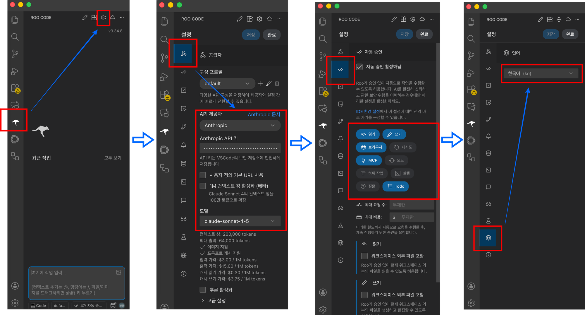 - LLM API 제공자와 API 키, 모델(claude-sonnet-4-5)을 입력하고, 자동 승인(읽기, 쓰기, 브라우저, MCP, Todo) 설정, 언어 설정등을 선택한다.